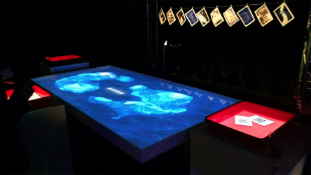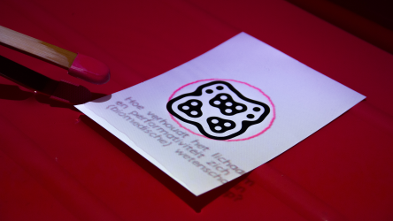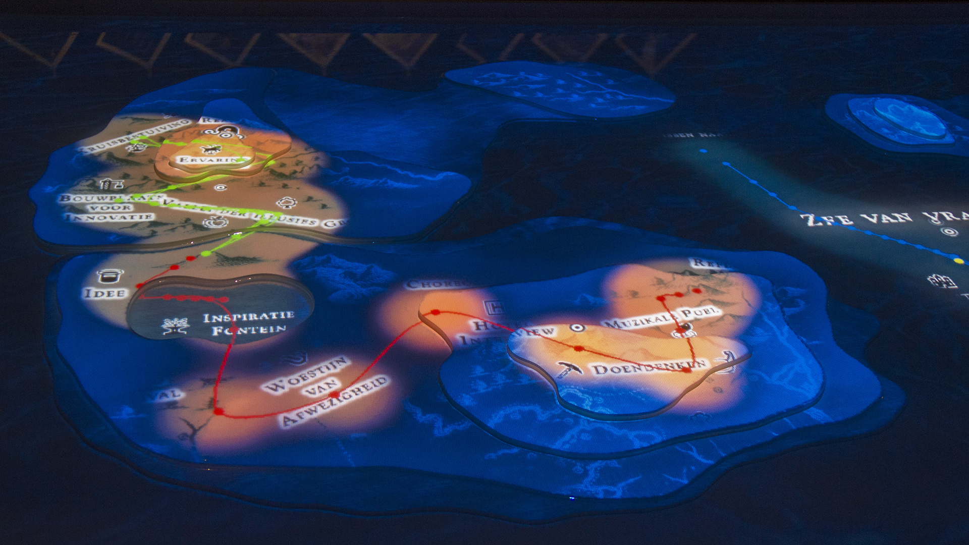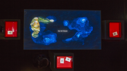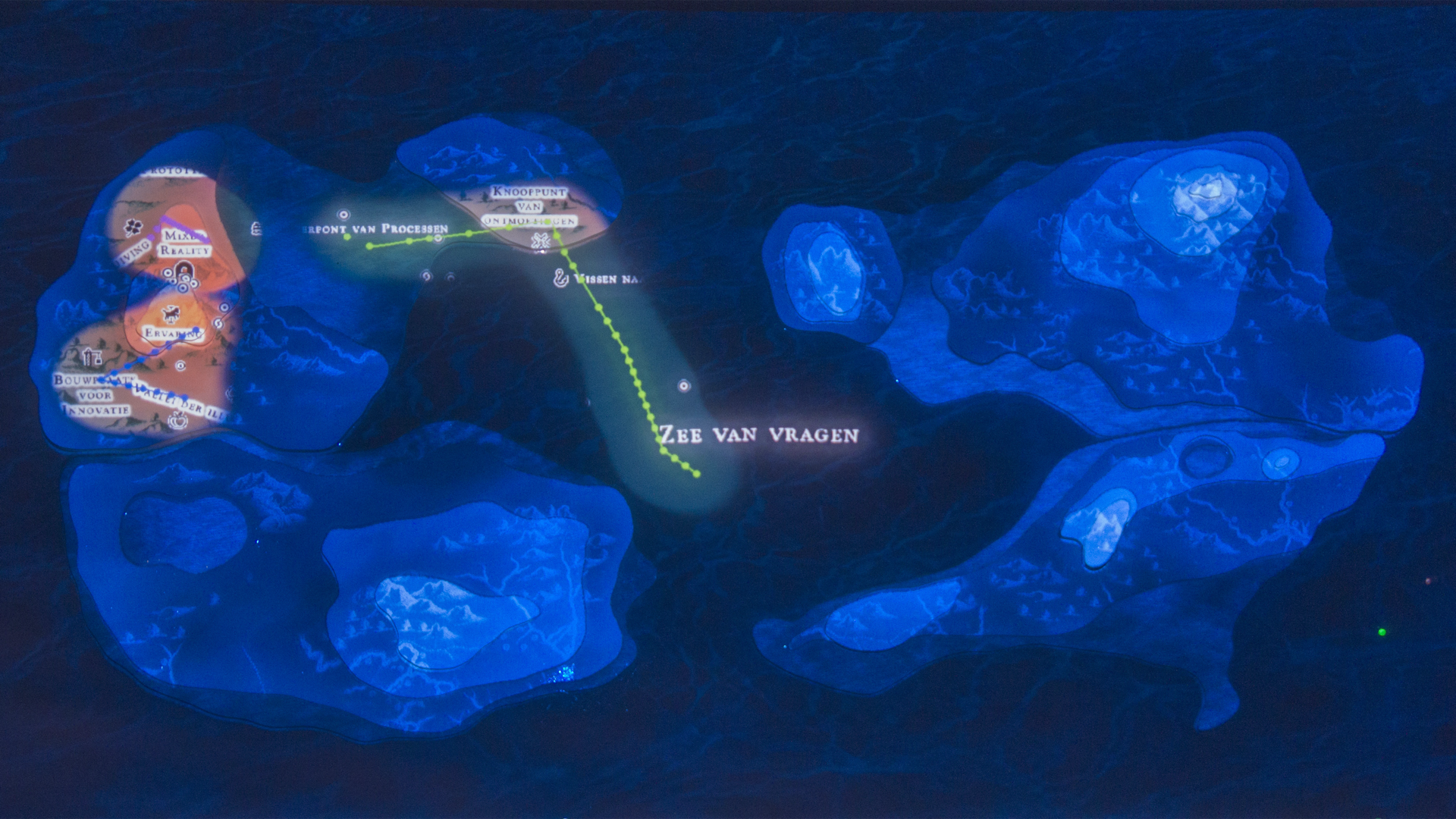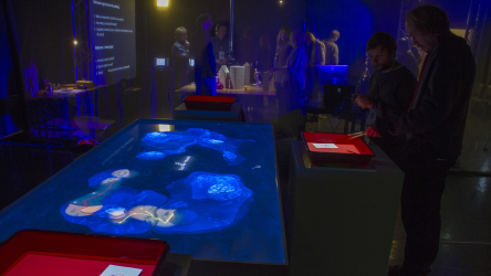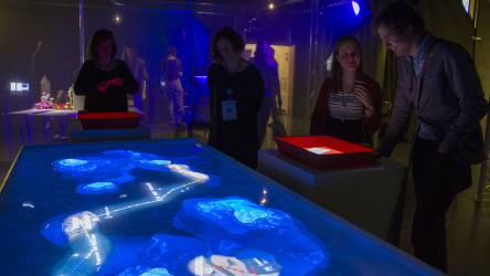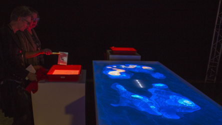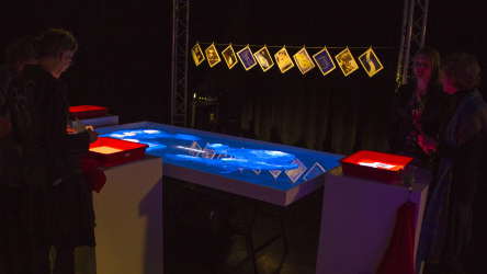 "Lectorlandia" maps the lectorate and its research by showing the routes and encounters of the visitors in a research landscape. At the entrance every visitor received a name badge with a unique RFID tag attached to it. This was used to track the x- and y coordinates of every single individual and to see when and where people match. Visitors were then able to develop their paths by entering their waterproof name badge into one of the three photo developing trays. The path they took became visible on the map and they received a research or design question on their badge relating to a specific place on their route. People could also enter their own research questions on one of the three booths at the entrance, which would pop up from the "Pool of Questions" if two or more people had matching interests.