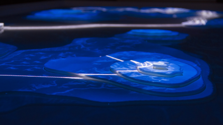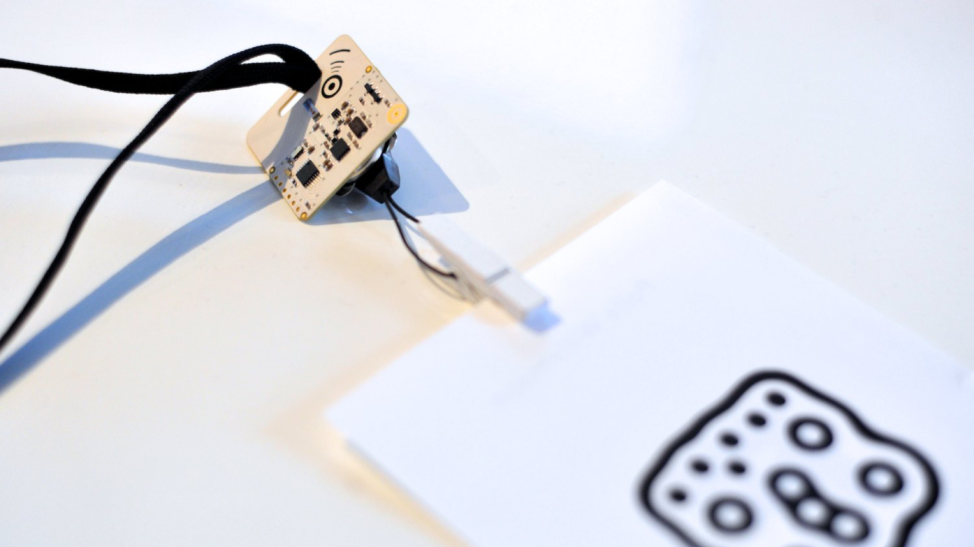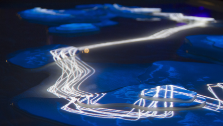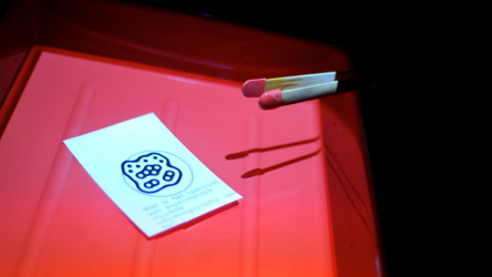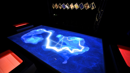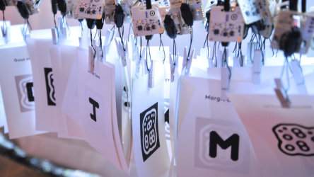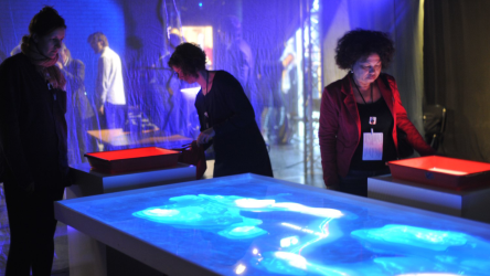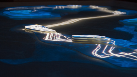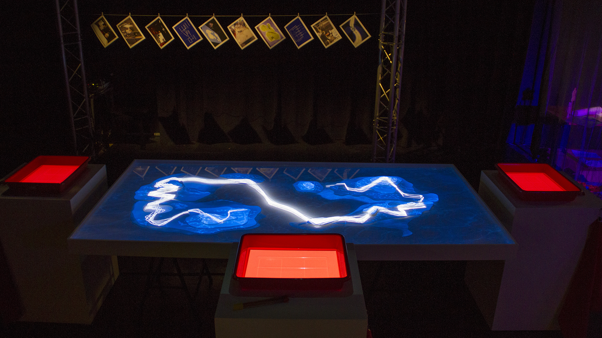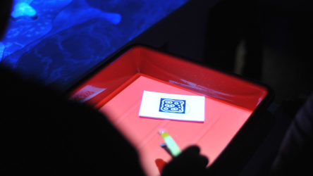 "Lectorlandia" maps the lectorate and its research by showing the routes and encounters of the visitors in a research landscape. At the entrance every visitor received a name badge with a unique RFID tag attached to it. This was used to track the x- and y coordinates of every single individual and to see when and where people match. Visitors were then able to develop their paths by entering their waterproof name badge into one of the three photo developing trays. The path they took became visible on the map and they received a research or design question on their badge relating to a specific place on their route. People could also enter their own research questions on one of the three booths at the entrance, which would pop up from the "Pool of Questions" if two or more people had matching interests.