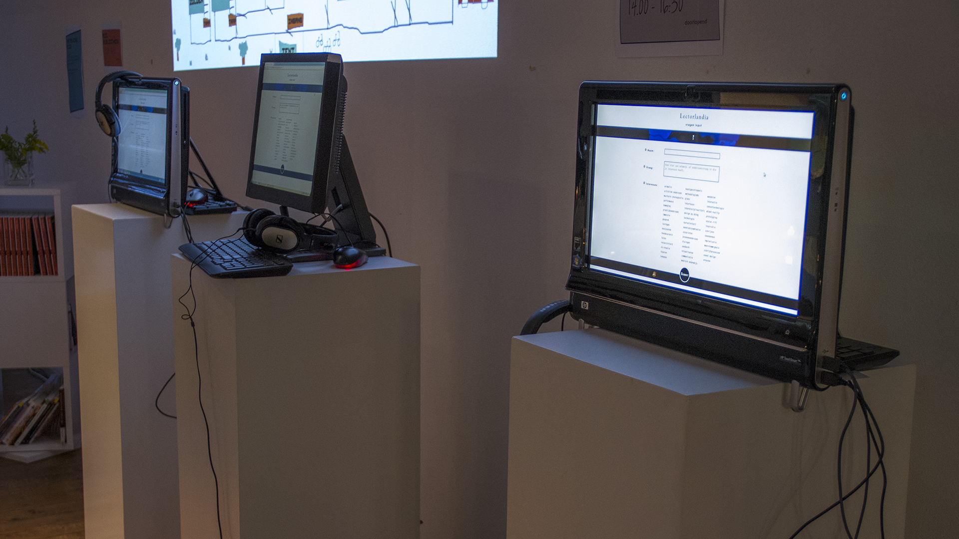 "Lectorlandia" is an interactive installation developed for the launch of the new HKU Lecorate "Research for Performative Making Processes”. The aim of the research group is to accelerate, ease and renew creative processes in and outside the arts by research into performative making processes. The launch of the lectorate consisted of the research festival "Formidable / Fort Minable" which took place at the Media and Performance Laboratory, followed by a public lecture "Do not forget you're many" by lector Nirav Christophe.