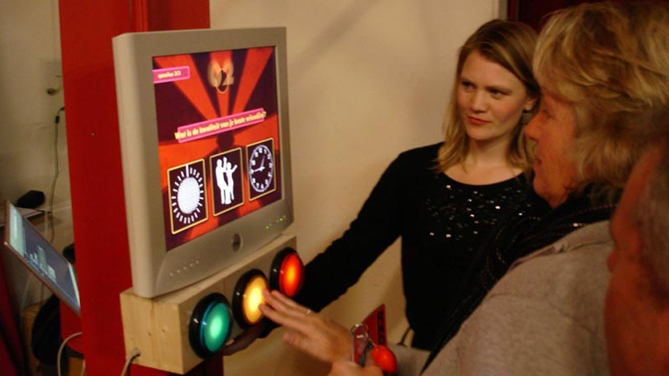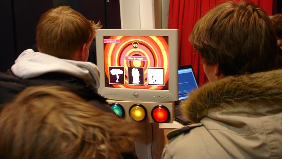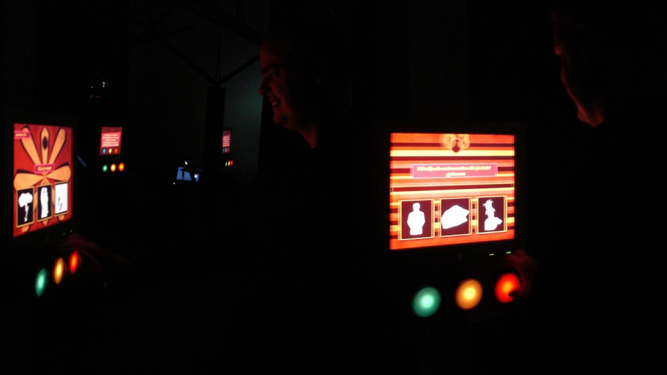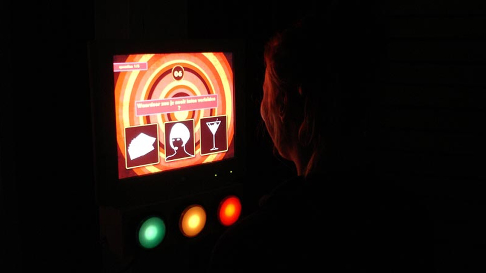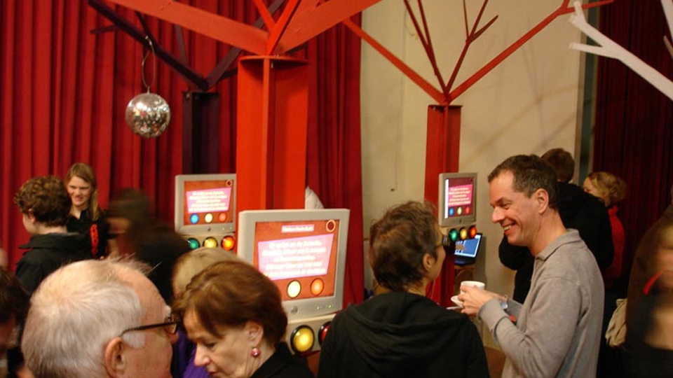 Parnassos is the cultural centre of the Utrecht university where you can learn to play instruments, theatre, dance and yoga. In December 2009 they celebrated their 15 year anniversary and organised several evenings to celebrate where the audience was divided in six groups and was guided through the whole building while enjoying different performances. For the division of the audience in six groups I created an interactive installation where the audience was sorted in groups based on the answers they gave on several multiple choice questions. I made six decision trees where each tree had an display and three buttons to answer the questions. People would give their name to the assistant next to the tree and that would start the questions. After they where sorted into groups they would get a card and a special prop identifying their group.